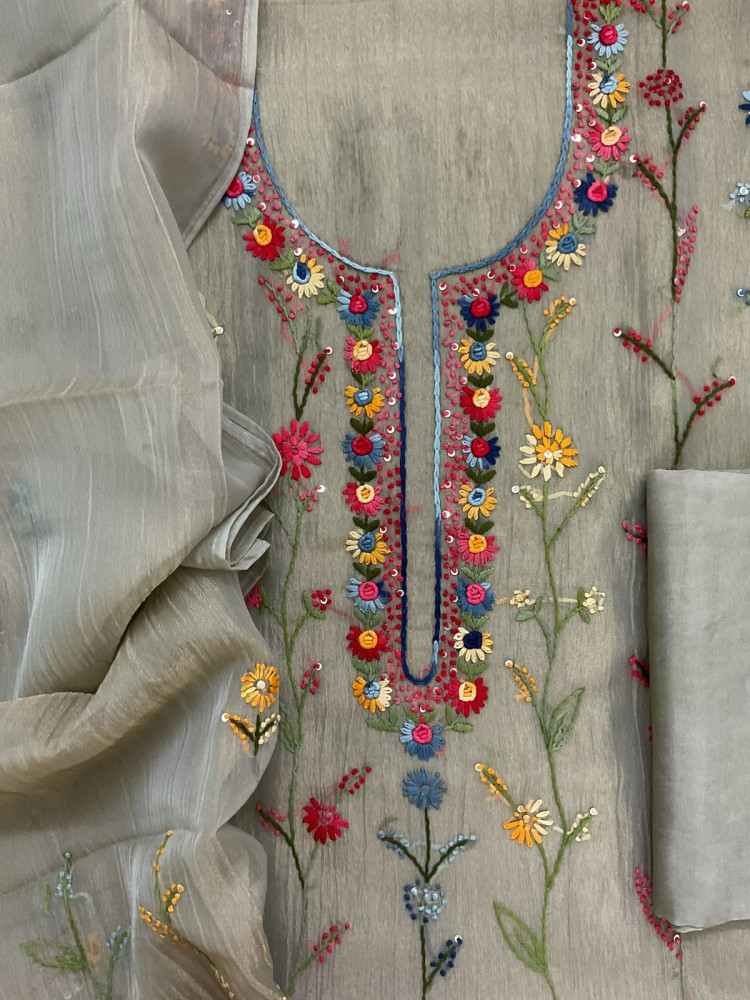 Pure crushed tissue fine embroidered top with pure crushed tissue fine embroidered dupatta and soft dola silk bottom