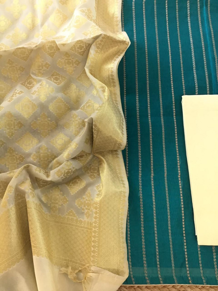 Soft chanderi embroidered top with soft chanderi Banarasi weaved dupatta and pure cotton/cottonsilk bottom